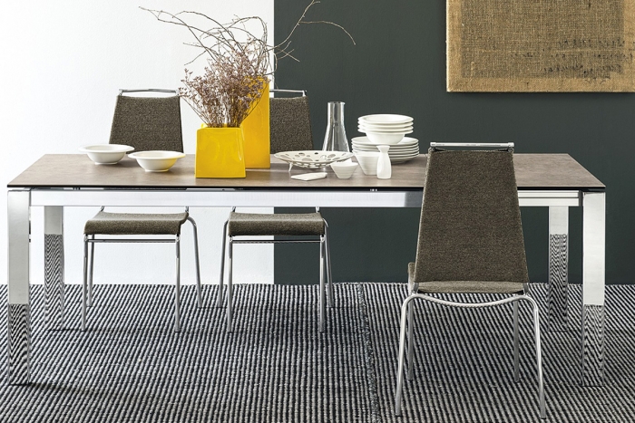 L’utilizzo di tecnologia all’avanguardia – meccanismo di allunga telescopico brevettato – ha permesso di realizzare un tavolo raddoppiabile in lunghezza con un unico, pratico movimento. Agendo infatti sulle maniglie poste sull’estremità corta e tirando verso di se, le allunghe escono da sotto al piano in successione e si posizionano automaticamente. Le gambe restano sempre perimetrali sui 4 lati, evitando così fastidiosi ingombri per i commensali.