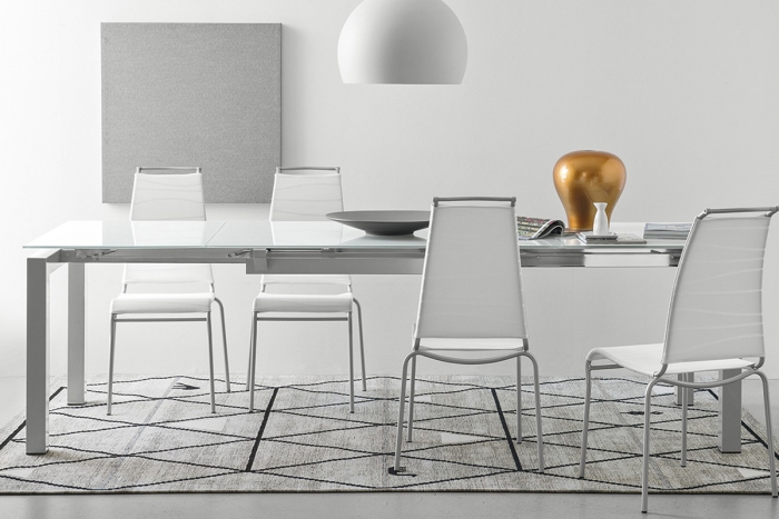 Tavolo modello AIRPORT, dalla struttura in metallo e piano in vetro di forma rettangolare. Super allungabile.