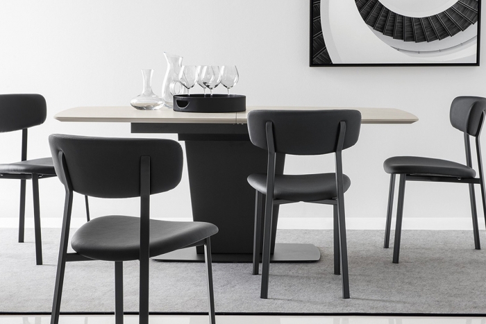 Sedia con struttura in metallo, sedie e schienale imbottite e rivestite in tessuto o ecopelle, in molteplici varianti di colore. SONORA, è caratterizzata da un fissaggio della spalliera senza viti a vista, e dall’estremità della struttura sagomata arrotondata.