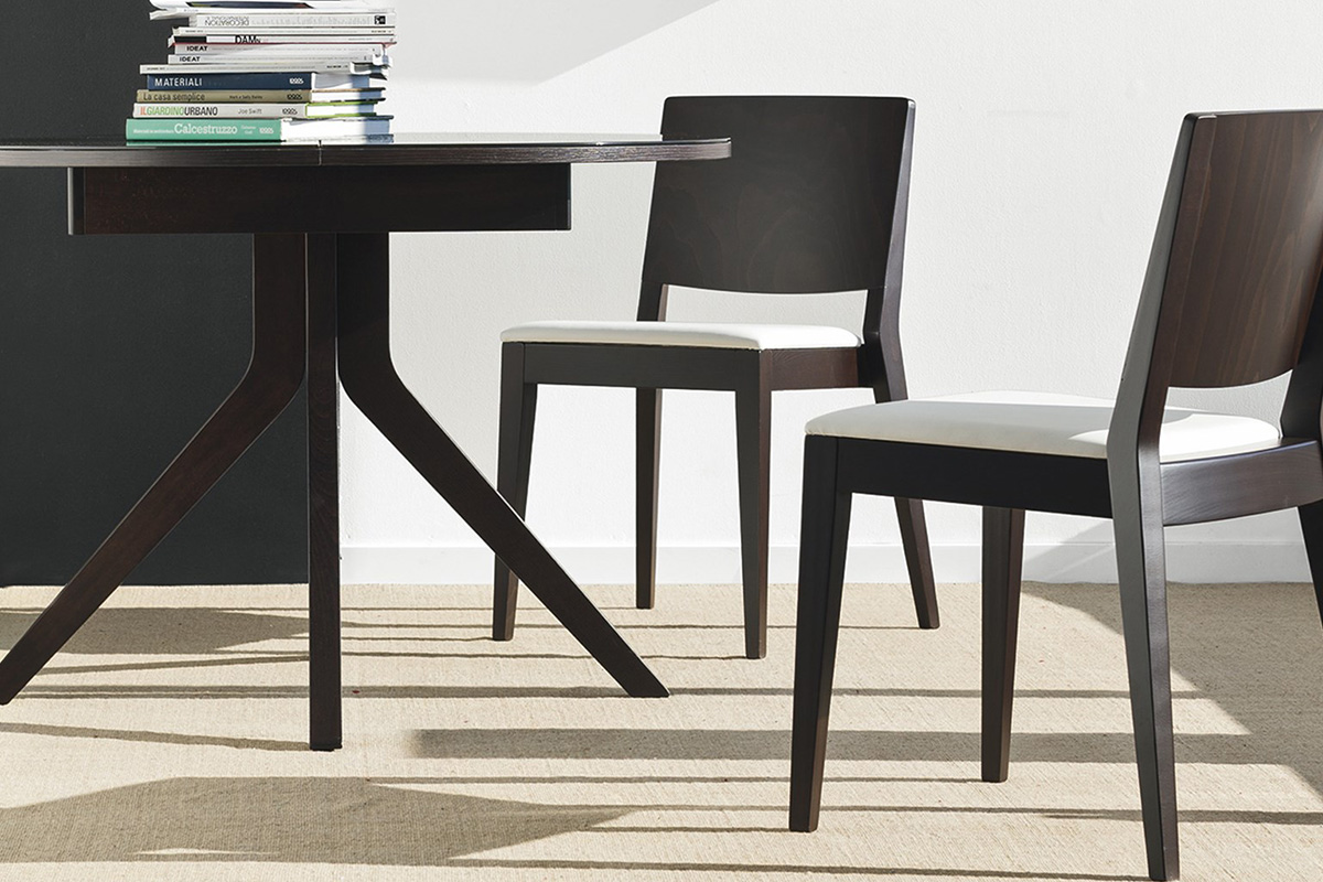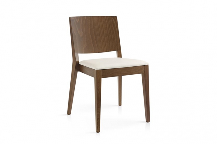 Sedia modello BISTROT dalla struttura in legno di faggio massello tinto. Sedile rivestito in tessuto tecnico spalmato. La cura progettuale delle linee rende questo prodotto originale e nello stesso tempo ergonomico. La robustezza della struttura in legno, unita alla praticità del rivestimento lavabile, compongono una sedia dalla massima funzionalità non solo in ambiente domestico ma anche per i bar, ristorazione e comunità.