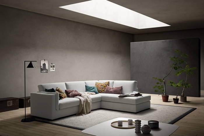 Design minimalista formato da incastri di volumi, in cui il cuscino bracciolo diventa punto di attrazione focale.