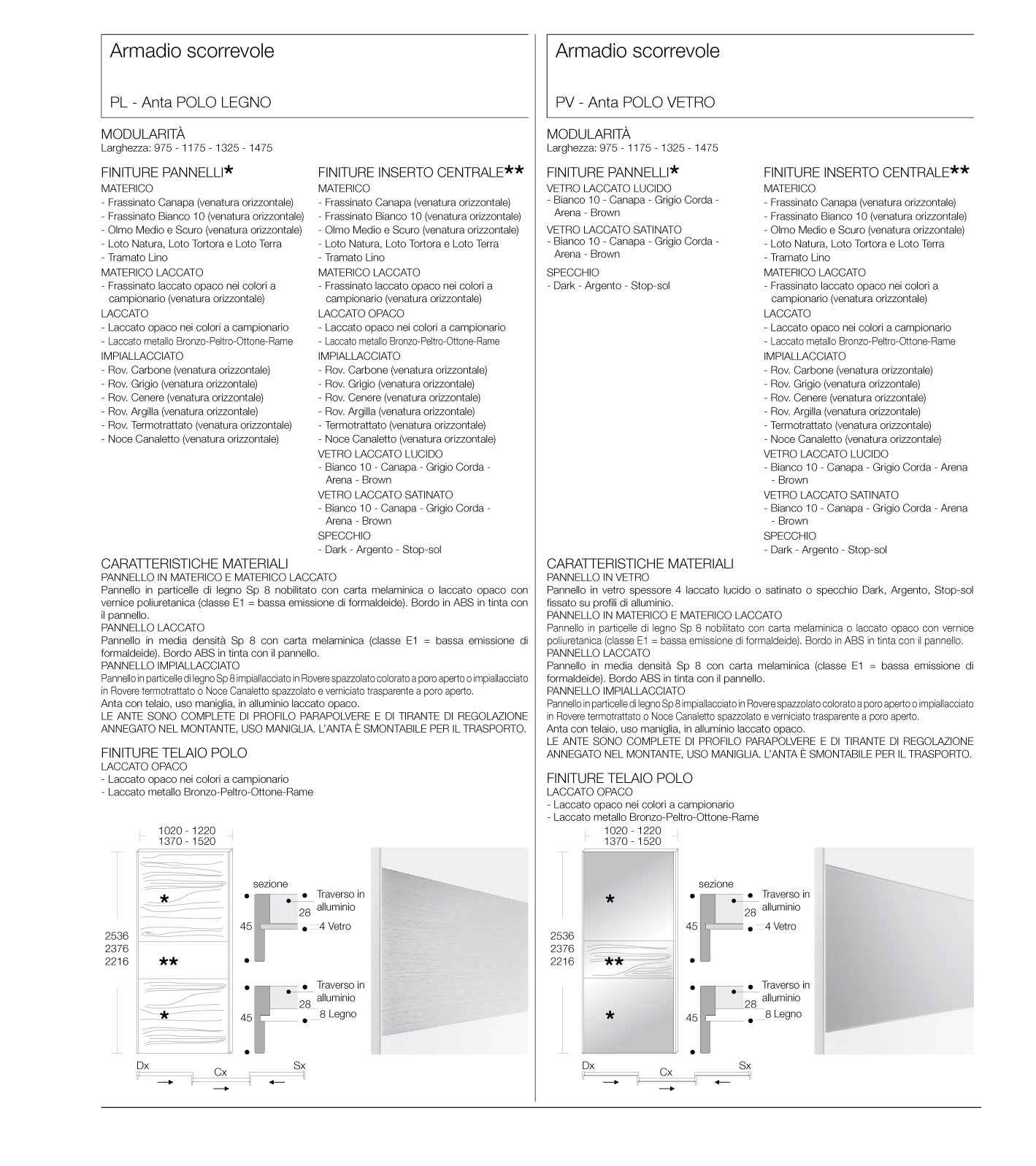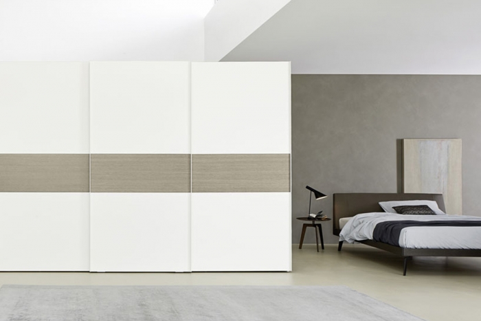 L’anta Polo si riconosce subito per la fascia centrale in vetro laccato oppure in materico frassinato laccato, o in essenza può essere in tinta o in contrasto: un segnale d’ identificazione che caratterizza l’intero guardaroba così come lo spazio circostante.