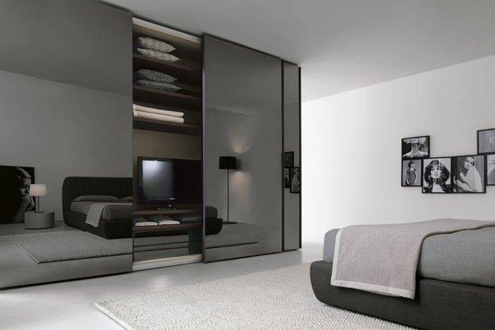 L’interno dell’armadio è dotato di vani e cassetti con gola, attrezzabili con separatore interno per riporre in perfetto ordine i vari accessori d’abbigliamento. La finitura è in elegante Olmo Scuro, con cassettiere in laccato opaco Juta, in tinta con l’esterno delle ante.