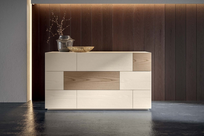 Il gruppo dei contenitori Alvin beneficia oltre che del tocco moderno, dato dai frontali di differente finitura e matericità, anche dal fianco con ripiano estraibile presente nel comodino.