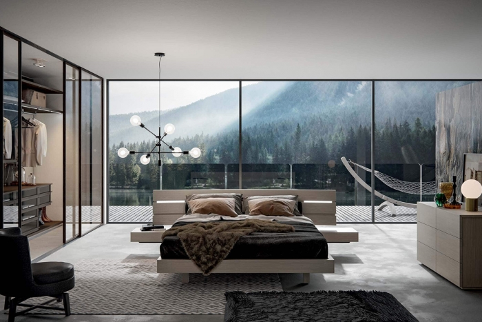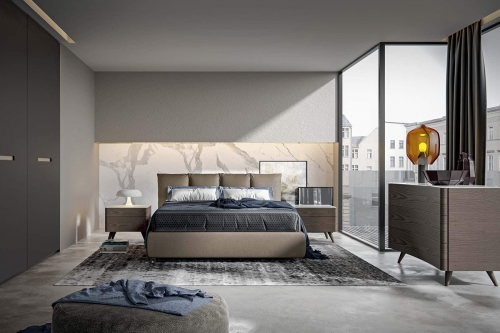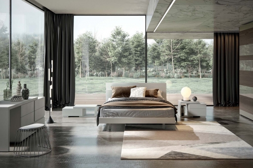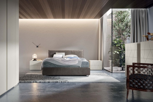 Nel letto Work la visione d’insieme è di grande effetto scenografico, grazie ai comodini sospesi incorporati al ring e l’ampia, oltre che avvolgente, testiera con luci led integrate.