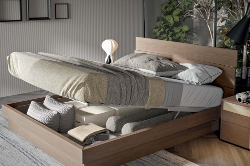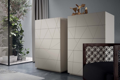 Il gruppo dei contenitori Alvin beneficia oltre che del tocco moderno, dato dai frontali di differente finitura e matericità, anche dal fianco con ripiano estraibile presente nel comodino.